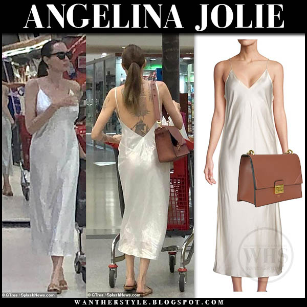 Angelina jolie was spotted wearing a stunning white slip dress as she shopped for groceries in fuerteventura. Her unique gown was created by atelier versace master tailor luigi massi. Jolie tied her hair back and complete her look with a pair of chic sunglasses.